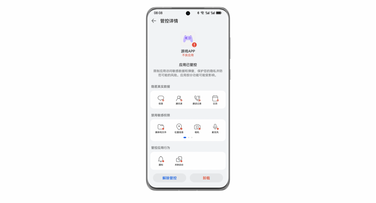 以华为为例,华为公司将网络安全与隐私保护作为公司的最高纲领,一直把对用户隐私安全的保护放在首要位置,用业界领先的创新科技不断升级隐私安全保障能力,在HarmonyOS 4系统中采用了多项先进技术,为用户提供全面的隐私保护。 其中,HarmonyOS 4升级后的应用管控中心通过卡片化的设计,让风险提醒更可观,面对应用内诱导下载其他应用的情况,系统会主动拦截风险并提醒用户选择取消安装。如果用户主动安装可能存在风险的应用时,系统会自动将应用加入应用管控中心受控运行,如禁止其访问位置、麦克风等敏感权限,同时隐匿联系人、通话记录等隐私数据,既能解决必要权限授权问题,又可保护用户隐私。